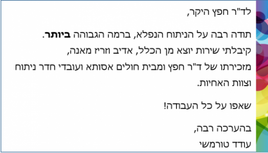 לד"ר חפץ היקר, תודה רבה על הניתוח הנפלא ולאנה על השירות…