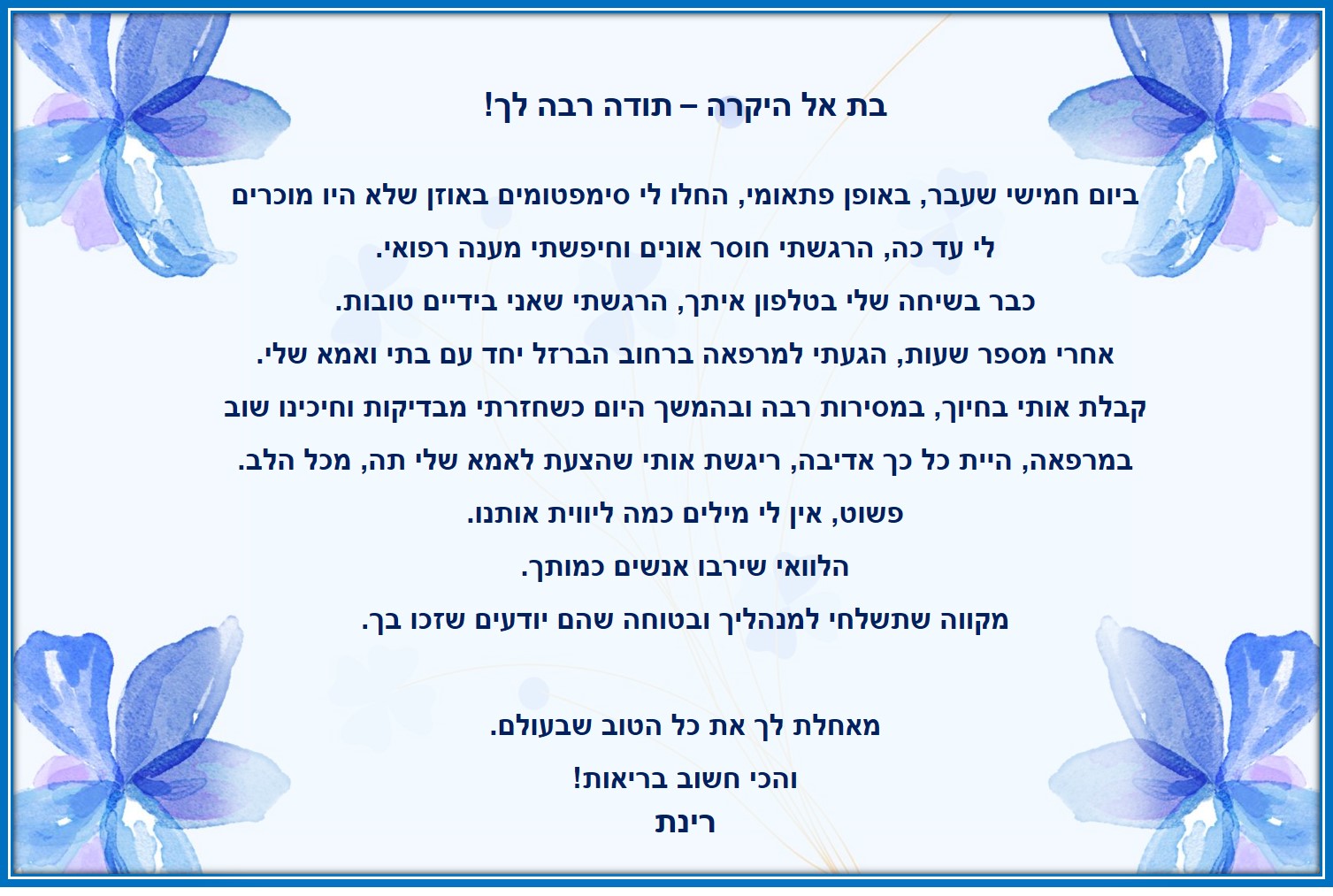Home | מכתבי תודה | בת אל היקרה – תודה על אדיבותך ורגישותך – כן יירבו אנשים כמותך!